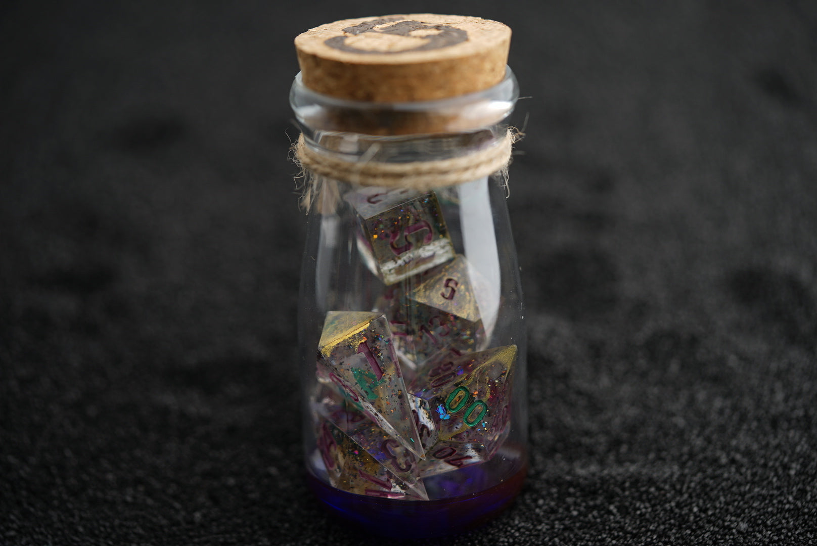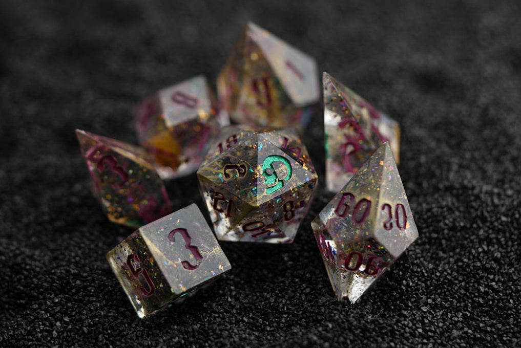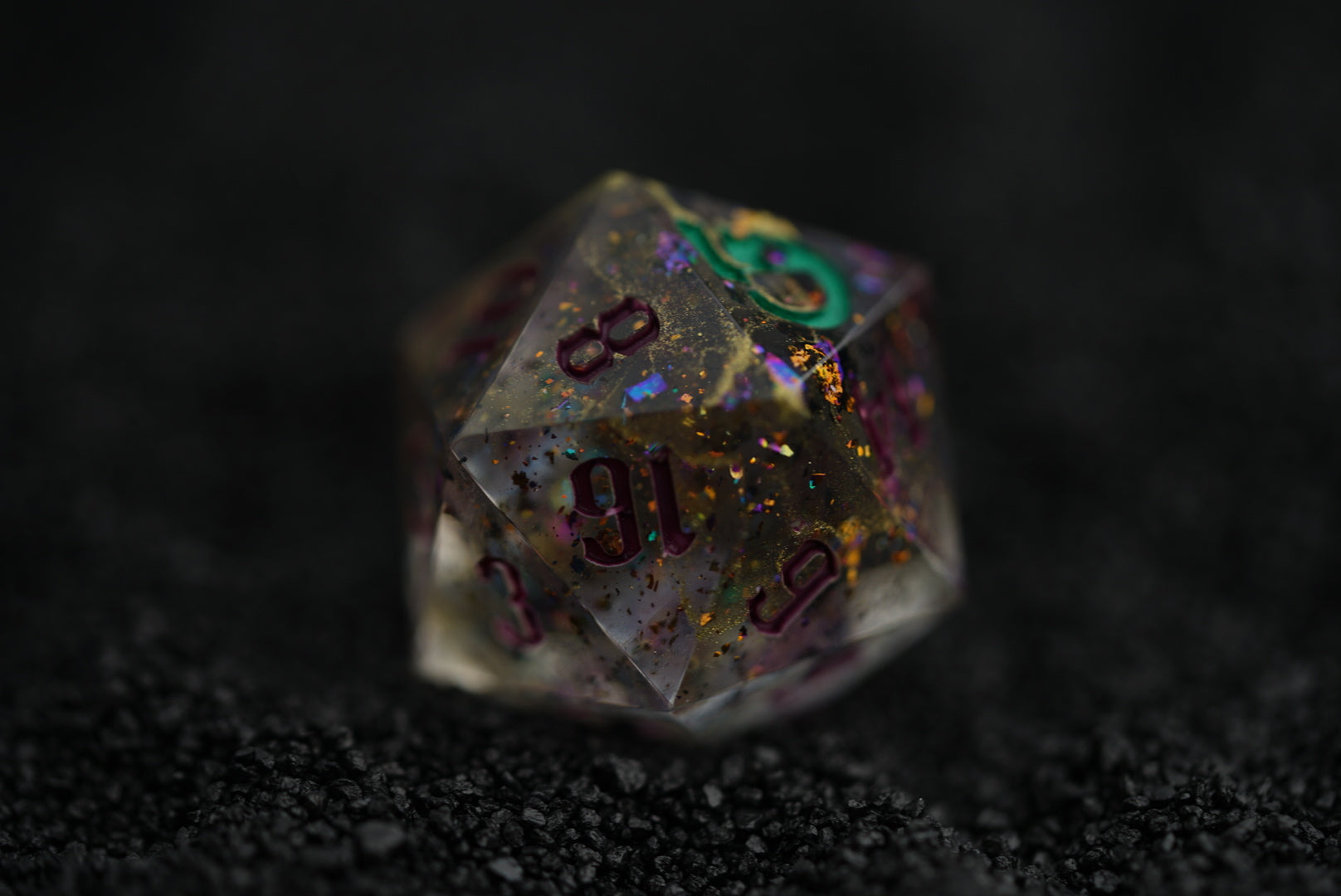Crystal-clear resin bursting with confetti flakes and plum-purple numerals. Chaotic-good energy for when the plan is ‘vibes first, strategy after.’
